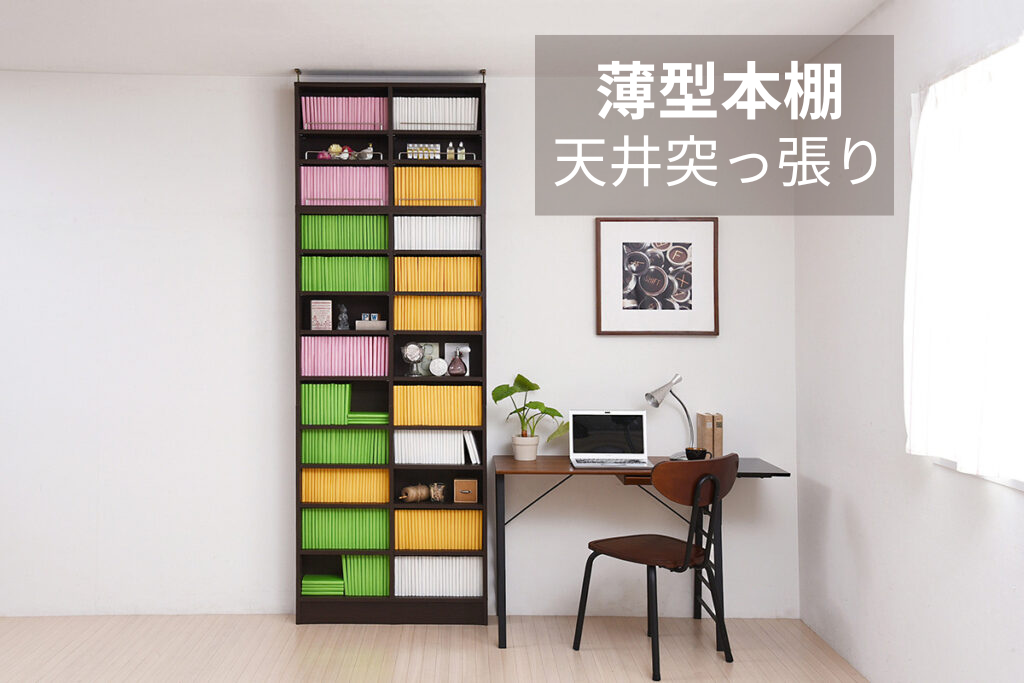 薄型本棚本体だけでももちろん大丈夫なのですが、さらに収納力を増す意味でも上棚を本体に追加でつけて本の収納を大量にすると共に、耐震対策にもなる商品が本棚の天井突っ張り式のメリットでもあります。