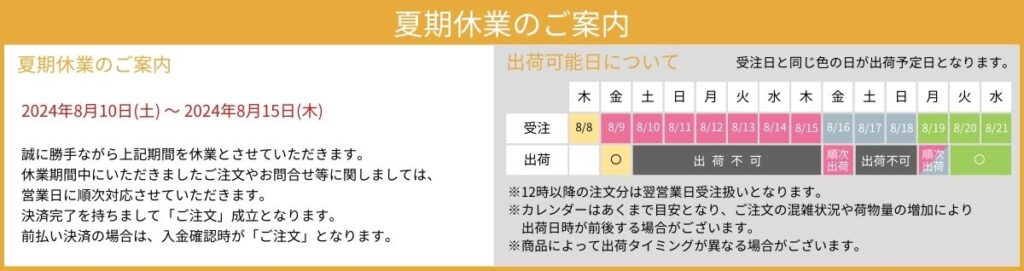 休業期間中にいただきましたご注文やお問合せ等に関してましては、営業日に順次対応させていただきます。
